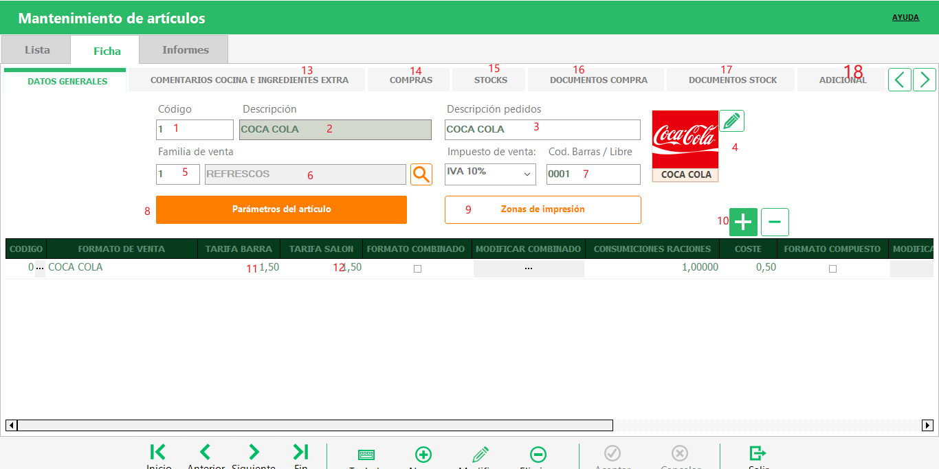 - 11,12 这种填写价格,在这行上还一个比较重要的是Formatos de Venta ,点这行的前面…3点就行出来让你选择是以什么的形式来销售的,比如:按半份,1/3, copa, botella等等属性,也可以直接在这里添加新的销售形式。