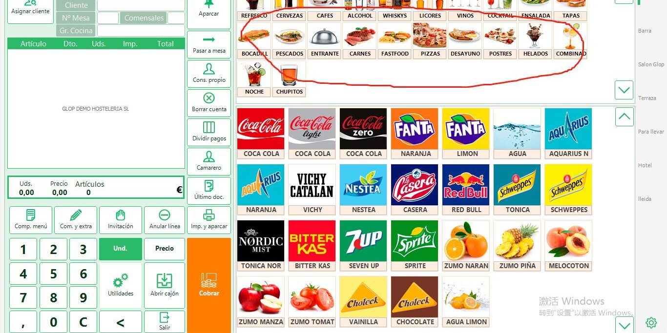默认情况所有添加的分类都会自动显示在这里,如果你有特殊的要求不想在这里显示的话,需要通过 configuracion–Terminale 里的 familias de venta 来修改. 而且还可以通过 Grupos de familias 设置把一些有相同属性的商品放一个类别来,比如:vino blanco, vino negro, vino rosado都放到一个类别vinos这样相当于增加了一个二级类别让分类更清楚。同时还可以通过articulo–grupos de trabajos来添加一些分类,可以从不同的分类里选一菜组成一个特别的分类,比如添加一个NOCHE的分类把NOCHE上常用的菜都加到这里更能方便一起点菜。